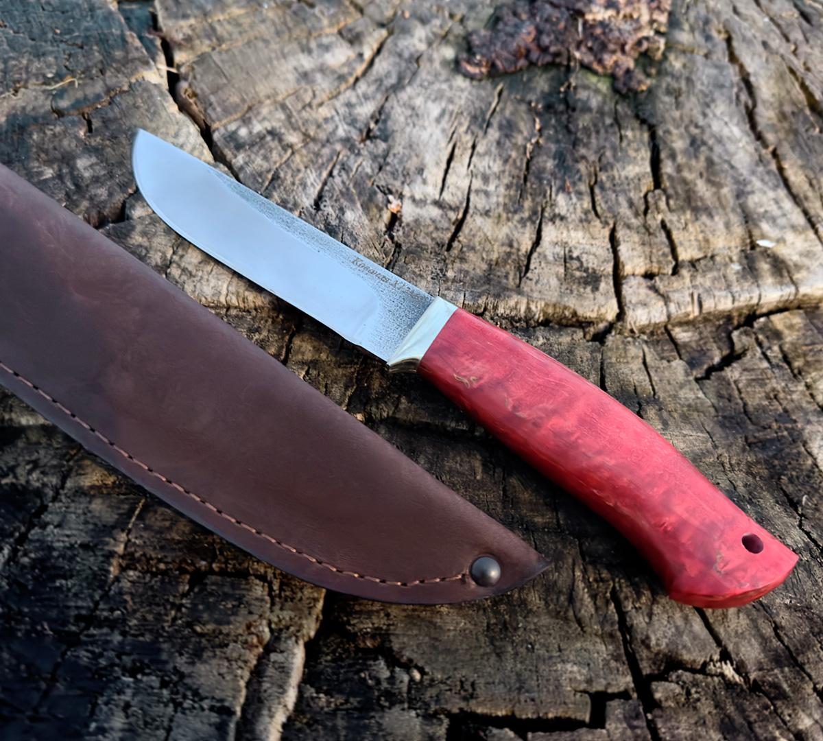 Нож Белка из кованной стали Х12МФ, рукоять - стабилизированная карельская береза, кожаный чехол идет в комплекте.